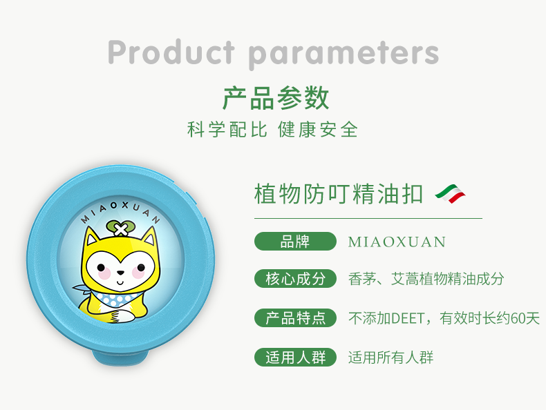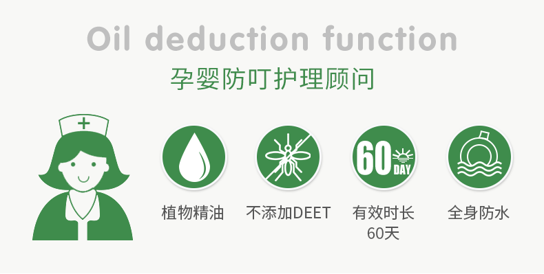 经典再升级,360°旋转卡扣,角度随心切换。加量天然植物精油 ,缓慢挥发形成保护圈,远离叮扰,防水材质,遇水也不怕,宝宝们可以尽情嬉戏。